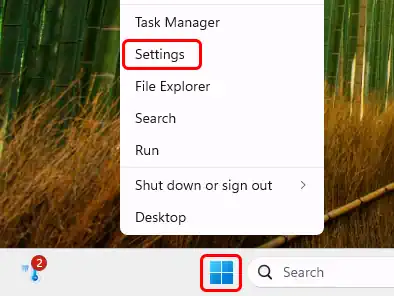 Right-click the Windows Start icon, and select "Settings" from the pop-up menu: