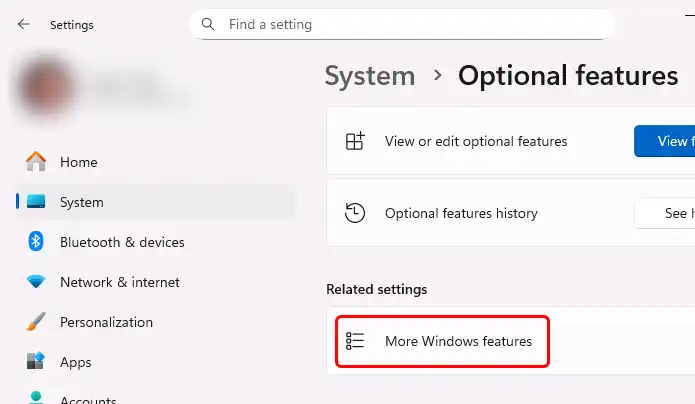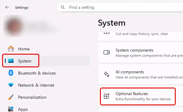 In the left-side menu, click "System", scroll down to the bottom of the list and click "Optional features":