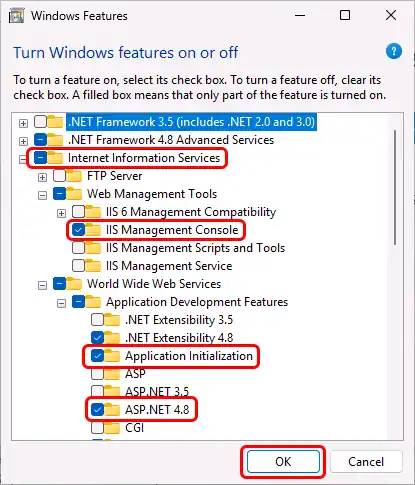 Expand "Internet Information Services", expand "Web Management Tools" and enable "IIS Management Console", expand "World Wide Web Services", expand "Application Development Features", and enable "Application Initialization" and "ASP.NET 4.8", and click the "OK" button: