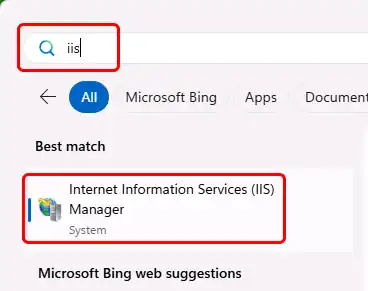 You should now be able to open "Internet Information Services (IIS) Manager". In the Windows Start menu search for "iis" and it should come up: