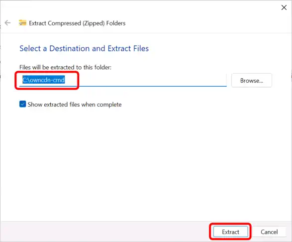 Open the folder where you downloaded the "owncdn-cmd.zip" file to in File Explorer, select the downloaded file, select the "Compressed Folder Tools" tab, and click the "Extract all" button:
